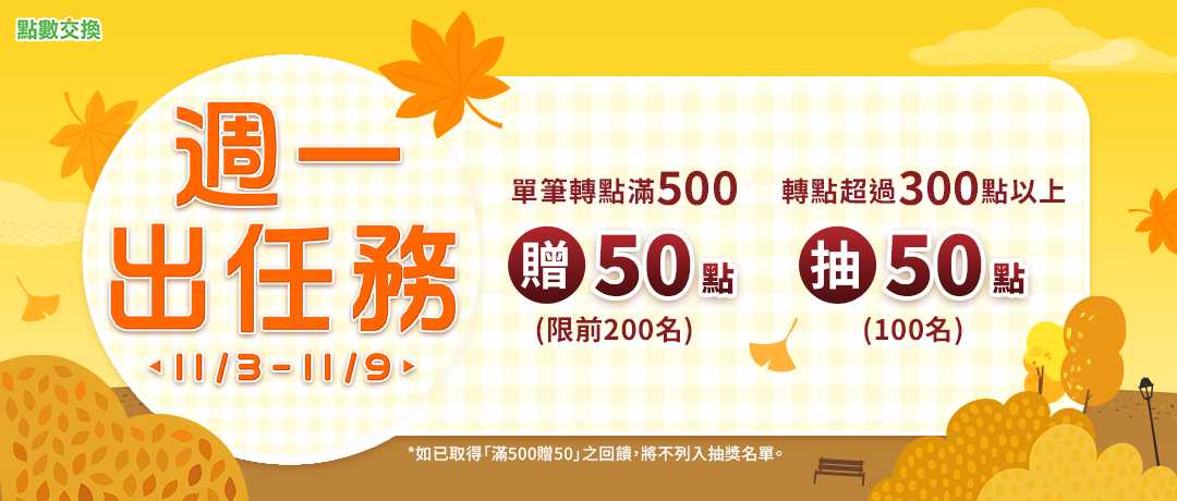 於活動期間 2025/11/03-11/09,單筆轉點滿 500 贈 50 點,限前200名;轉點超過300點以上抽50點(100名)。(詳下方注意事項)