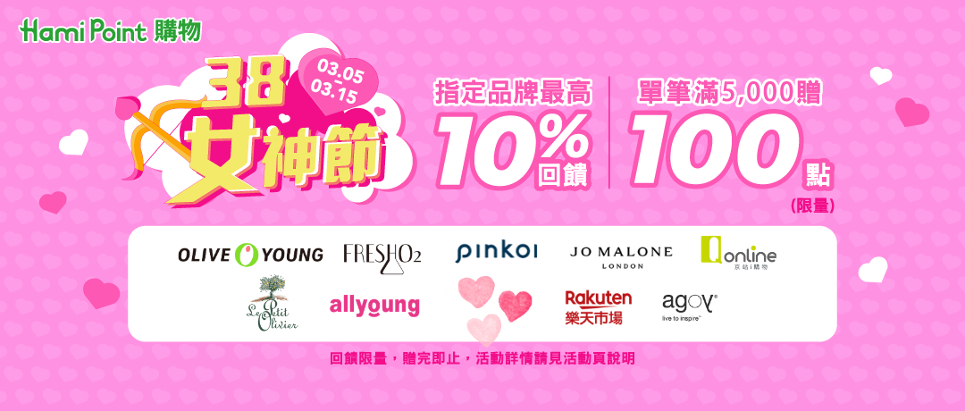 3/5-3/15 活動期間透過 Hami Point購物 前往指定品牌網站 (allyoung 歐漾、Jo Malone London、Le Petit Olivier 法國小橄欖樹、FreshO2、Olive Young、京站i購物Qonline、agoy瑜伽、Pinkoi、樂天市場),單筆實際消費滿$5000贈100點(限前200名),加碼贈點限量,贈完即止。